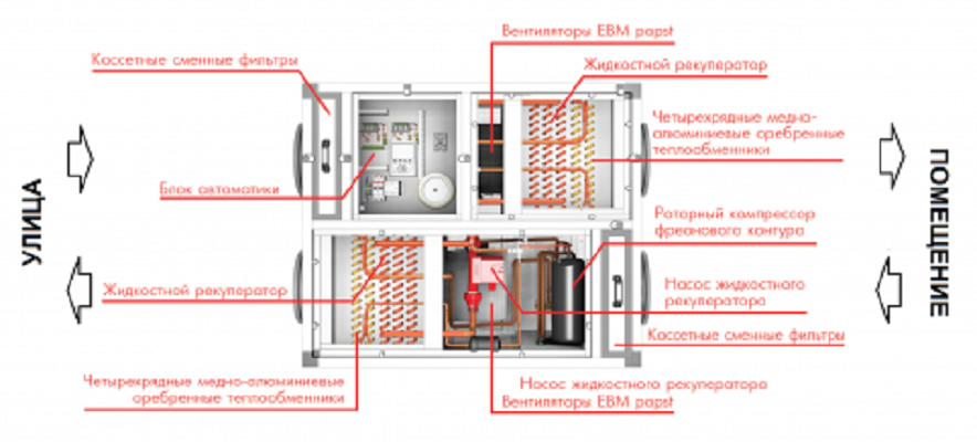 - Подогрев приточного воздуха с помощью встроенного реверсивного теплового насоса.