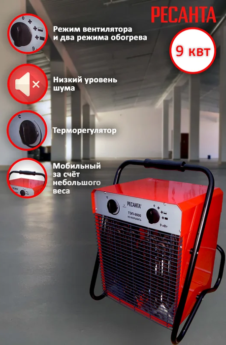 Тепловая пушка Ресанта ТЭП-9000 может использоваться для поддержания комфортной температуры воздуха в производственных помещения, а также для сушки в строительстве. Агрегат быстро нагревается и равномерно распределяет тепло. Модель выполнена в компактном металлическом корпусе, оснащена устойчивыми ножками и удобной ручкой для перемещения.